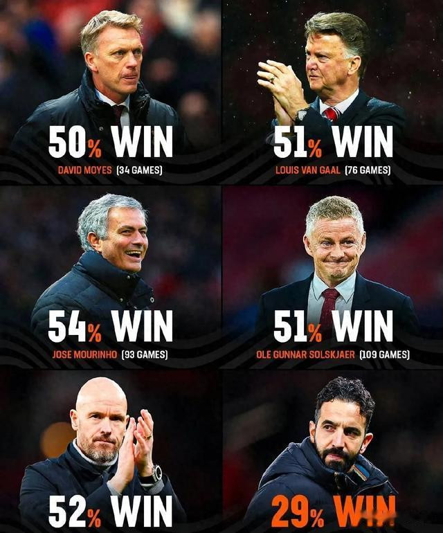 回溯后弗格森时期,穆里尼奥以54%的胜率彰显出冠军教头的风韵,带队斩获多项荣誉;滕哈格初入曼联时也怀揣着回应红魔的壮志,胜率保管在52%;范加尔和索尔斯克亚的胜率均为51%,莫耶斯虽任期片晌,但也有50%的胜率。相较之下,阿莫林的29%显得水火覆盖,成为曼联这段泛动岁月里又一个令东说念主唏嘘的注脚。